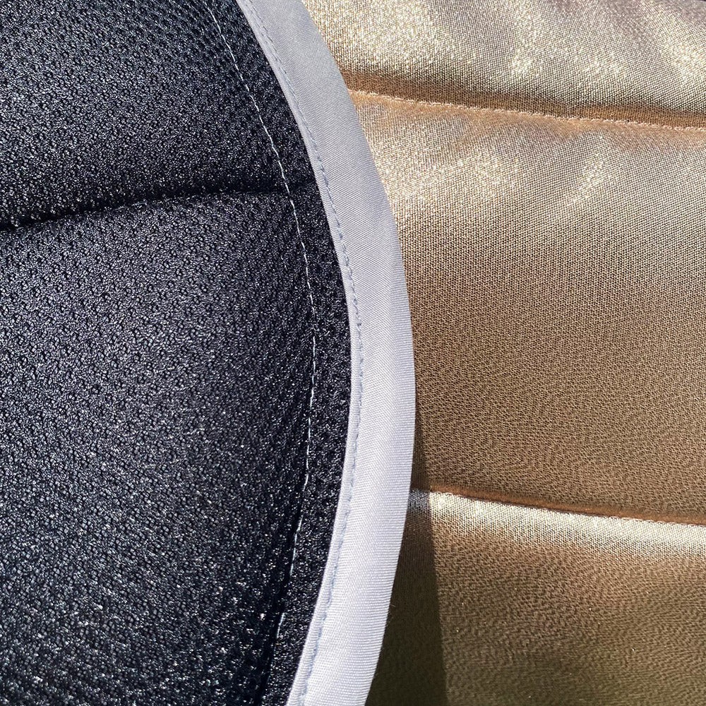 It is made in 3D Mesh on the inside (3mm thick) - also called spacer or sandwich fabric. This makes this pad PERFECT for use in hot and humid conditions. The unique material works as a small cushion effect while allowing air to circulate. The 3D mesh gives your horse all the comfort needed during intense effort.